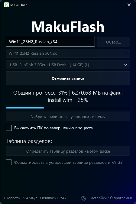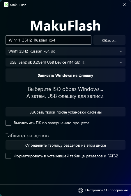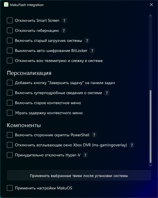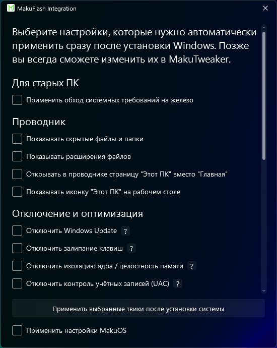 Эксклюзивно в MakuFlash присутствует функция интеграции твиков в будущую систему: от обхода проверок на системные требования железа до полного отключения Центра обновления Windows и изоляции ядра.